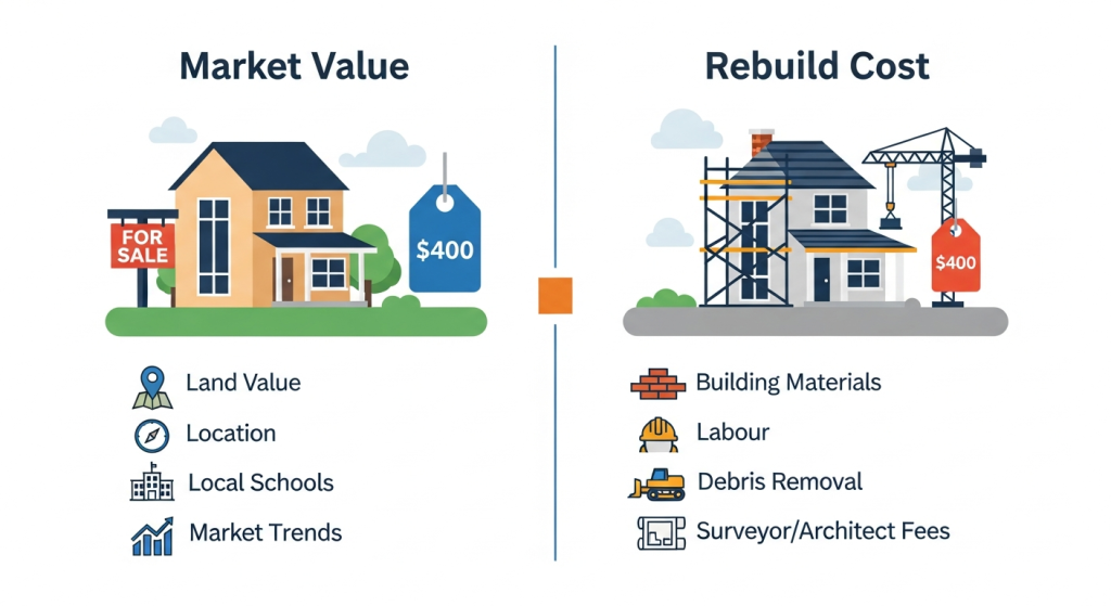 One of the most common and costly mistakes homeowners make is confusing a property’s market value with its rebuild value. They are two fundamentally different calculations.